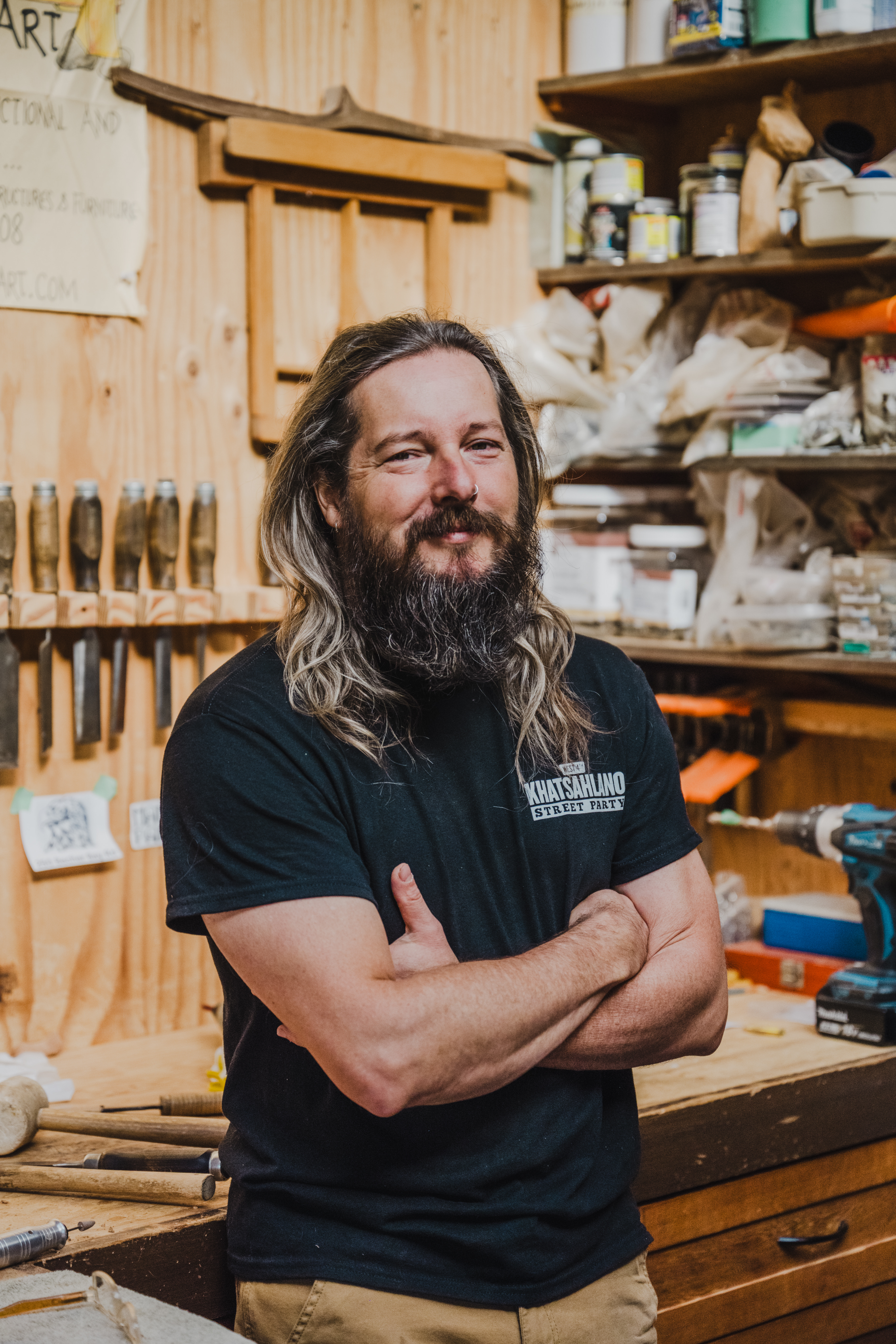 With a background in visual arts and a lifetime of travel behind him, Colin has settled into life as a woodworker on Pender, where he transforms reclaimed red cedar into carved sculptures and finely crafted furniture. His studio is rooted in sustainability, and nature remains his greatest source of inspiration.