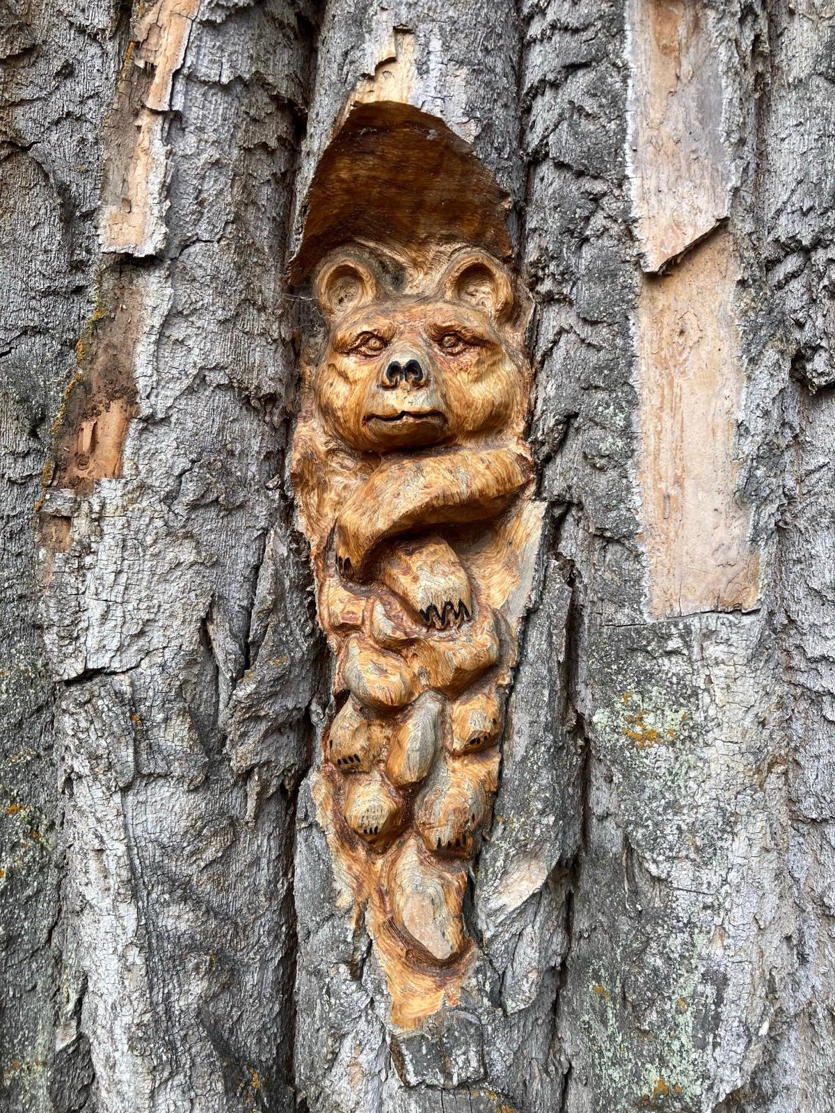Photo by Fernanda Salla: Carved tree trunk sculpture by Elmer Gunderson, hidden along the trails of Cottonwood Island Park.