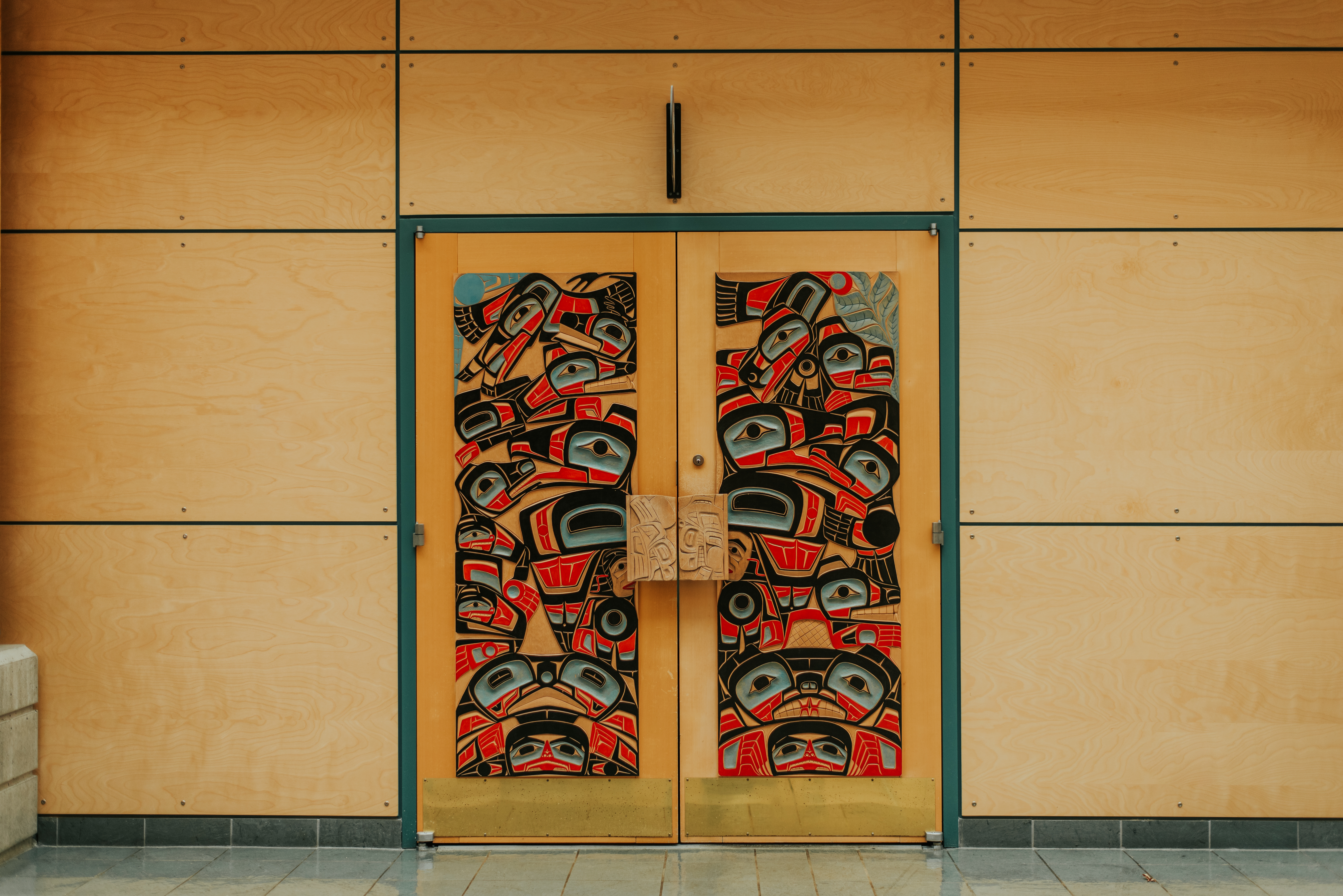Photo by Fernanda Salla: Carved cedar doors by Gitxan artist Ron Sebastian at the University of Northern British Columbia.